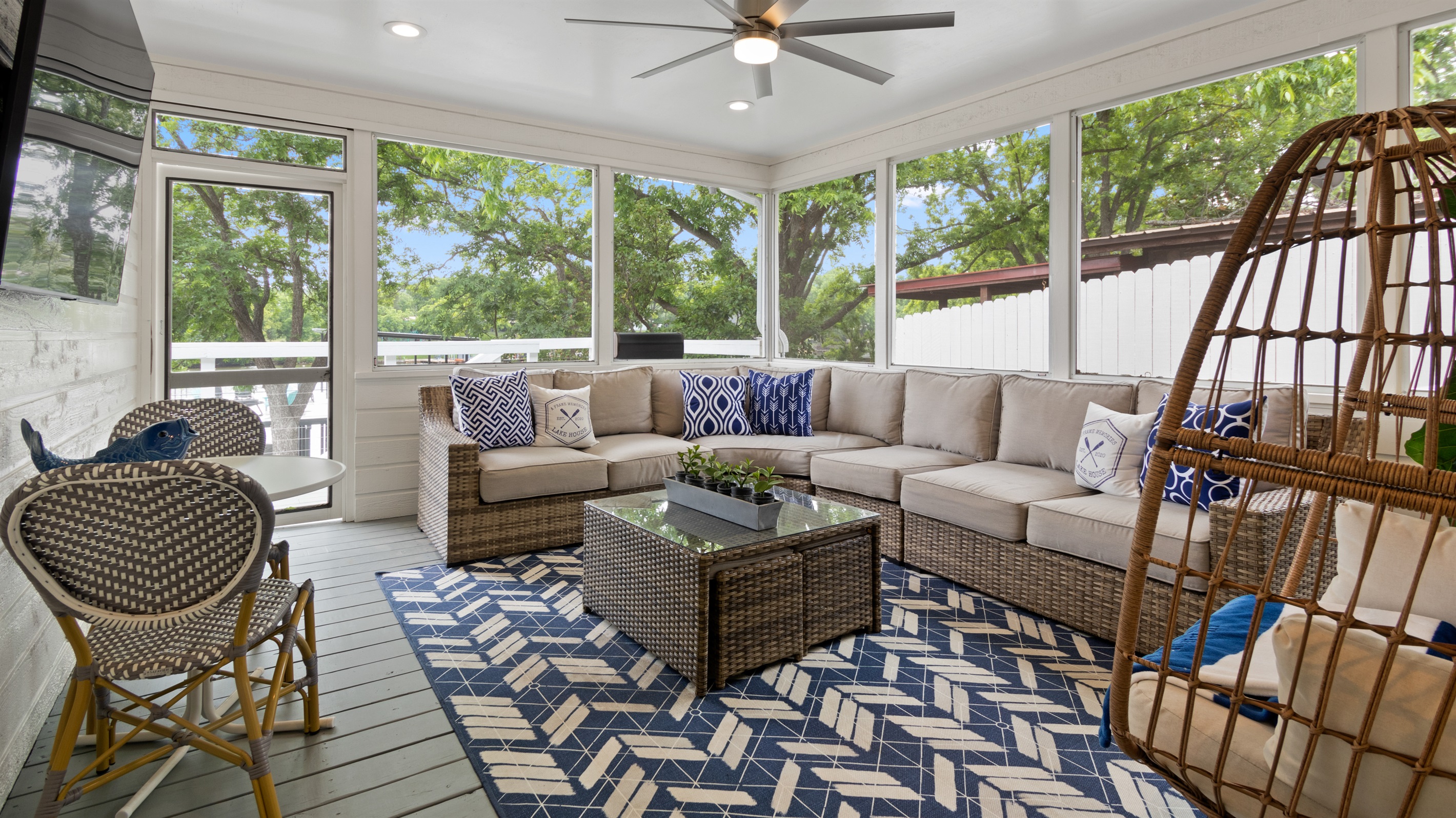 Additional screened in porch with a large sectional and 65-inch tv for morning coffee, afternoon enjoyment and another Football option. Additional dining area for 4 on the upper deck overlooking the lake. Plus, an additional 2-person bistro table by the gas grill perfect for chilling while the steaks cook to perfection. 4 additional white Adirondack chairs to relax overlook the lake from the second story.